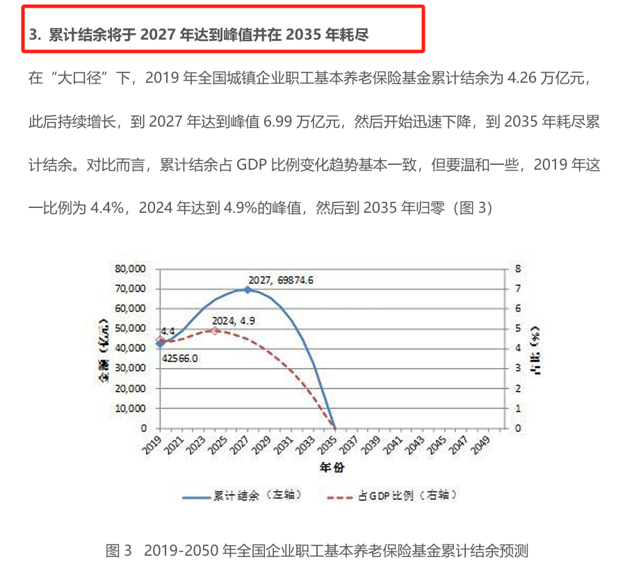 中国社科院在《中国养老金精算报告(2019-2050)》里这样写道:到2035年我国基本养老金累计结余会下降为0。