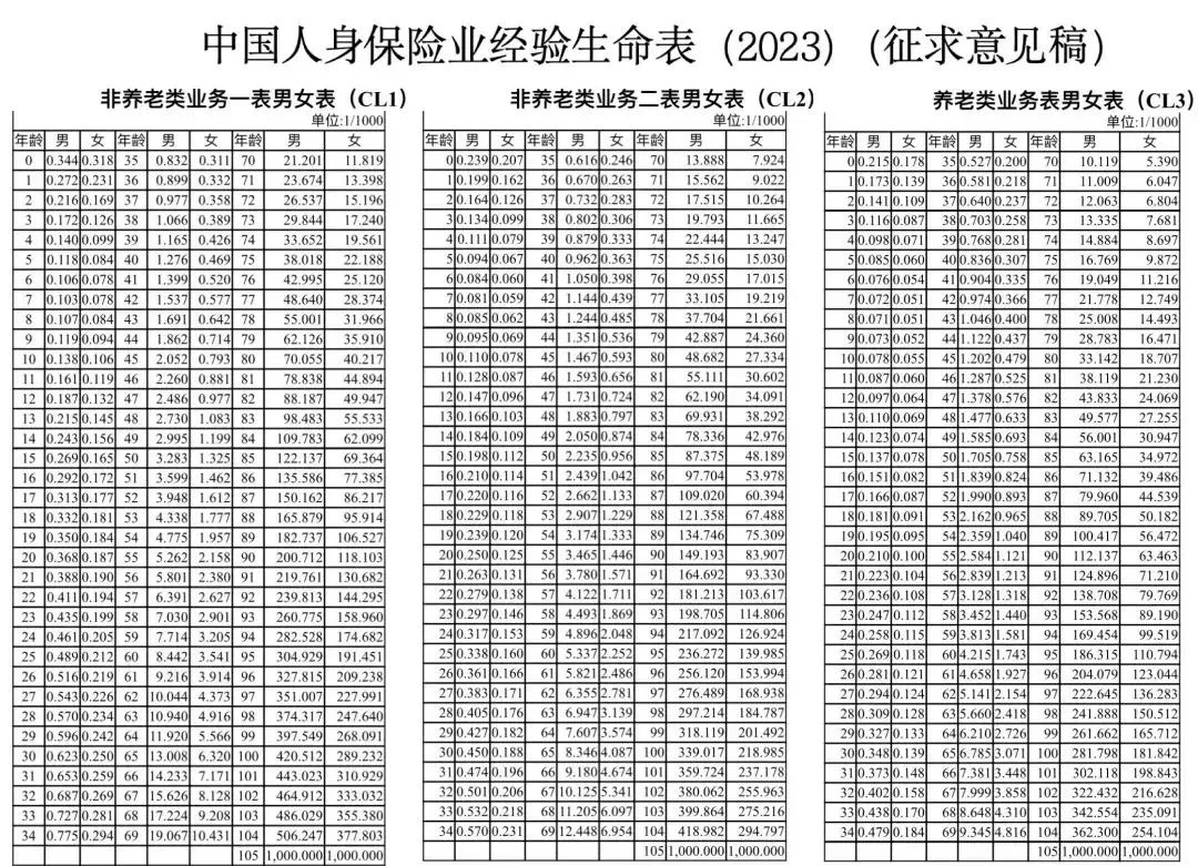 第四套生命表估计今年即将出台,男性的预期寿命提高至84.46岁,女性的预期寿命则提高至90.08岁。