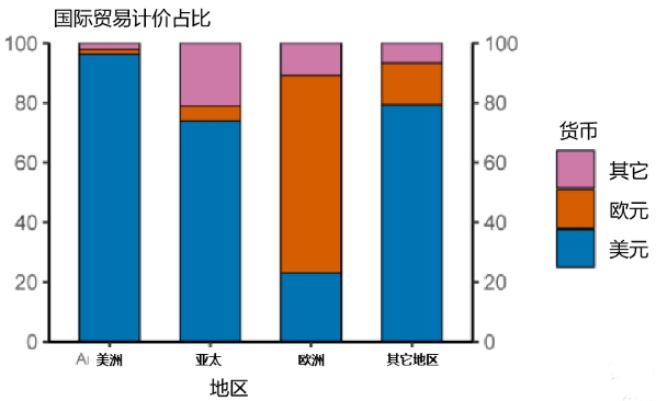 除了欧洲内部贸易以欧元为主,在亚太和其它地区贸易,美元占据绝对优势。以美元结算意味着这些商品的价格与美元挂钩。