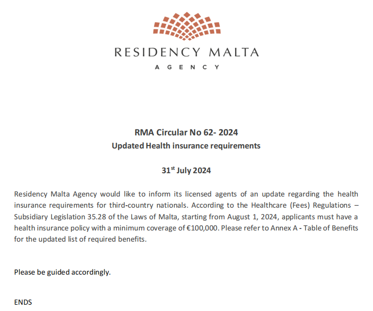 7月31日,马耳他移民局(RMA)更新了关于第三国国民的健康保险要求。
