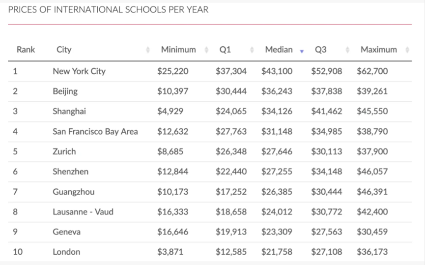 根据ISD国际学校信息平台公布了2021和2022年全球国际教育成本排行榜,该榜单的前十名,中国城市就已经占据4席。