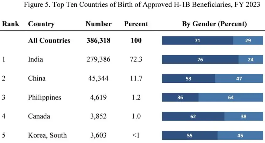 印度申请人的H-1B获签数量占比72.3%,排名第一。