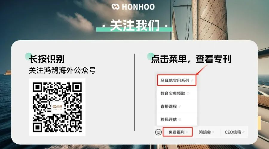 为帮助鸿鹄挚友们顺畅融入当地生活、将马耳他绿卡用到极致,我们在[鸿鹄海外]公众号上设立了[马耳他实用系列专栏],专为鸿鹄的马耳他申请人提供价值信息,欢迎大家关注公众号,我们会持续更新内容!