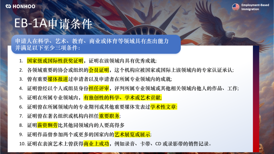 在详细解读细则之前,先来复习一下EB-1A的申请条件——需要满足以下10项中的任意3个及以上: