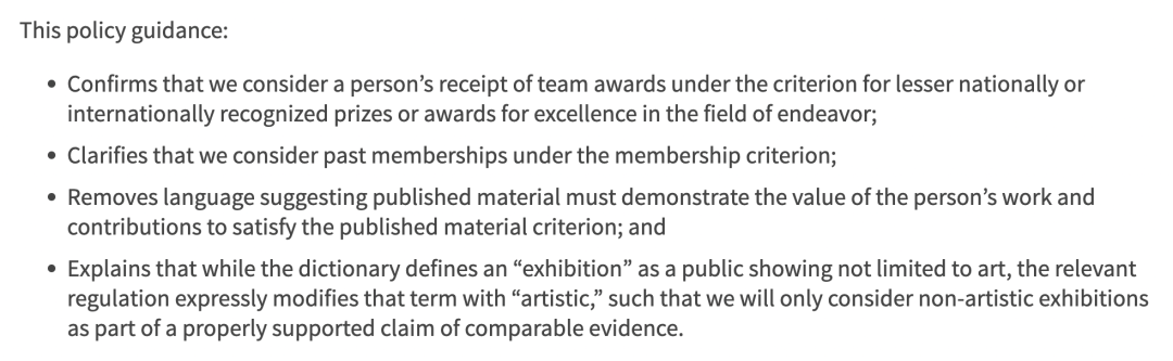 对具体申请人来说,这就一定程度上降低了符合通过获奖证明的难度,以往要证明这一条申请人得有足够分量的个人奖项,现在如果有符合条件的团体奖项也会被认可。
