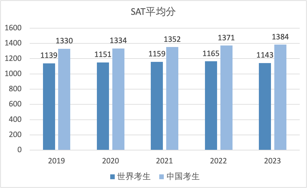 而中国学生在历年 SAT 考试中都保持着世界领先的优秀成绩,2023年SAT 平均分为1384,高于其它国家 / 地区。