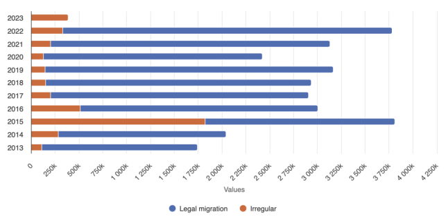 仅2022年就有约375万人移民欧洲,其中有340多万人首次获得了居留许可签证。