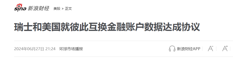 2024年6月27日,瑞士和美国签署了新的海外账户税收合规法(FATCA)协议,确立金融账户数据互换机制。
