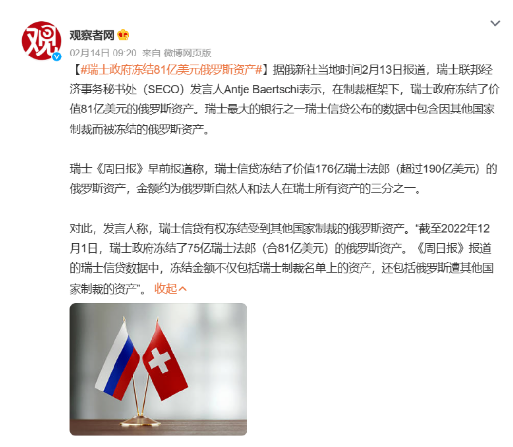 瑞士配合美国的要求,对俄罗斯实施制裁,冻结了俄罗斯官方和个人高达190亿美元的资产。