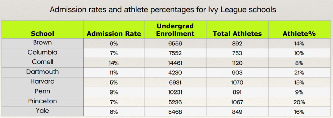 布朗大学,整体录取率9%,而体育生录取率有14%;