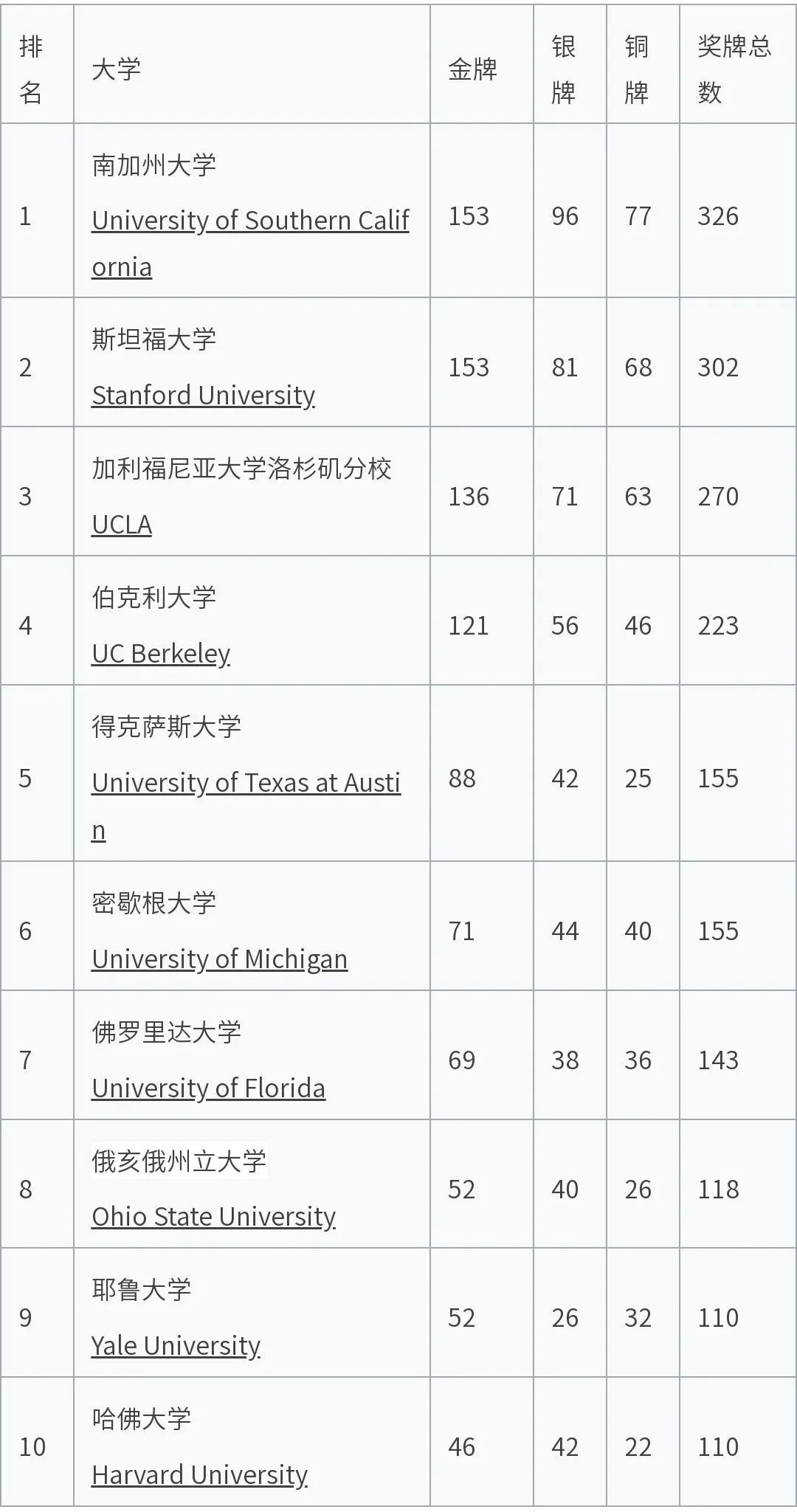 以下是全美奥运奖牌排名前十的大学: