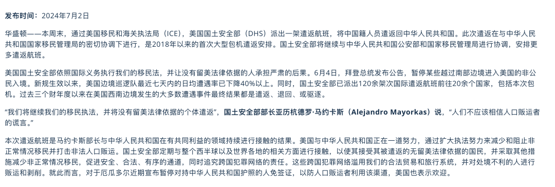 美国国土安全部发声明说,“国土安全部将继续与中国公安部和国家移民管理局合作,安排更多遣返航班”。