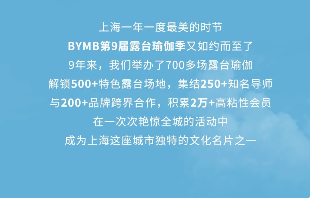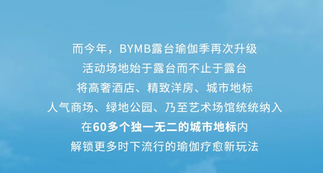 每一年露台瑜伽季,BYMB都致力于发掘更多的活动场地,不断探索、升级瑜伽新玩法,创造更多更丰富更有趣的瑜伽体验,这也是每届露台瑜伽活动都能充满惊喜,让BYMB的会员们深刻体会瑜伽魅力的内因。
