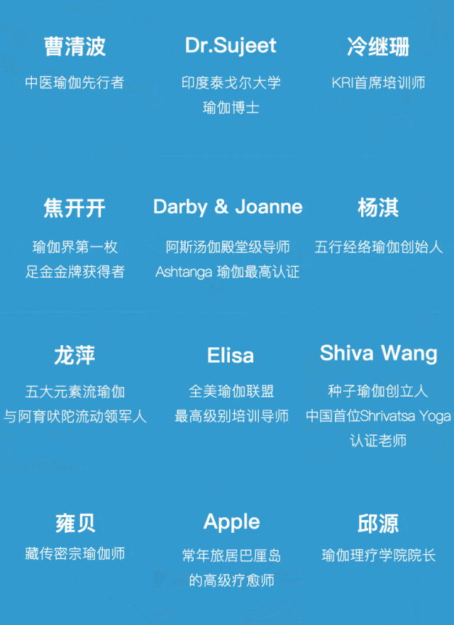 包括印度泰戈尔大学瑜伽博士Dr. Sujeet;中国女性中医瑜伽先行者曹清波;五行经络瑜伽创始人杨淇,以及白宸东、周晓媛、Ganesh、范炎炎、米博士、龙萍、Nithesh、Mr. Singh、Shiva、Andrew、Simon、Elisa 、Vis、土嘉妤、Seri、Jonas、Snow、小蓓、Eddie、Shao Rusty、Mana、KT Mona、Irina、Ananda、Nora、Marc、Lita、张婷、Ellen、雍贝、Chai等等。