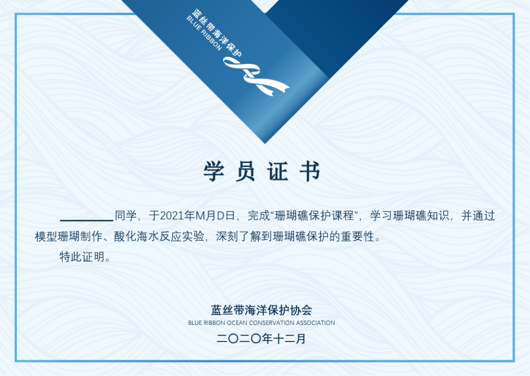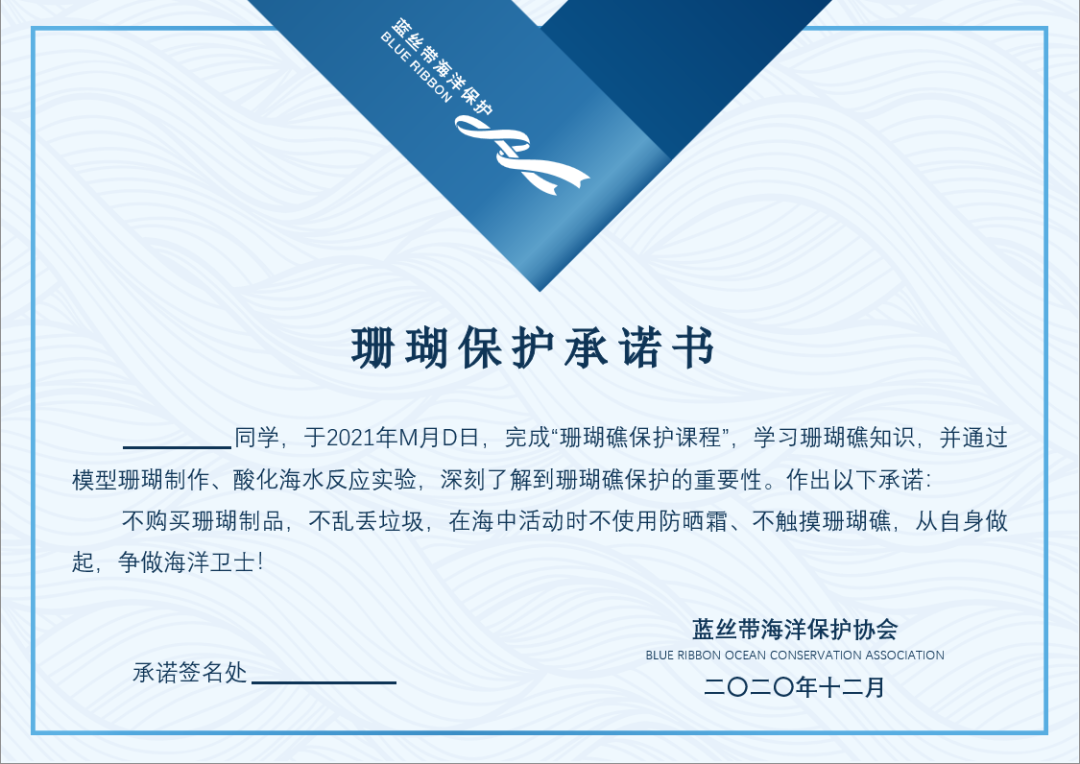参与环保课程的孩子,将获得蓝丝带海洋保护协会学员证书和珊瑚保护承诺书,成为海洋密不可分的环保卫士。