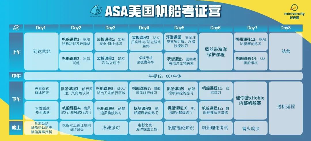 迷你营携手寰球拓海——ASA美国帆船协会中国认证的航校,让孩子们在ASA专业教练的引领下,尽享御风前行的每一航程。为习惯了广袤陆地的孩子,推开户外新世界的大门。